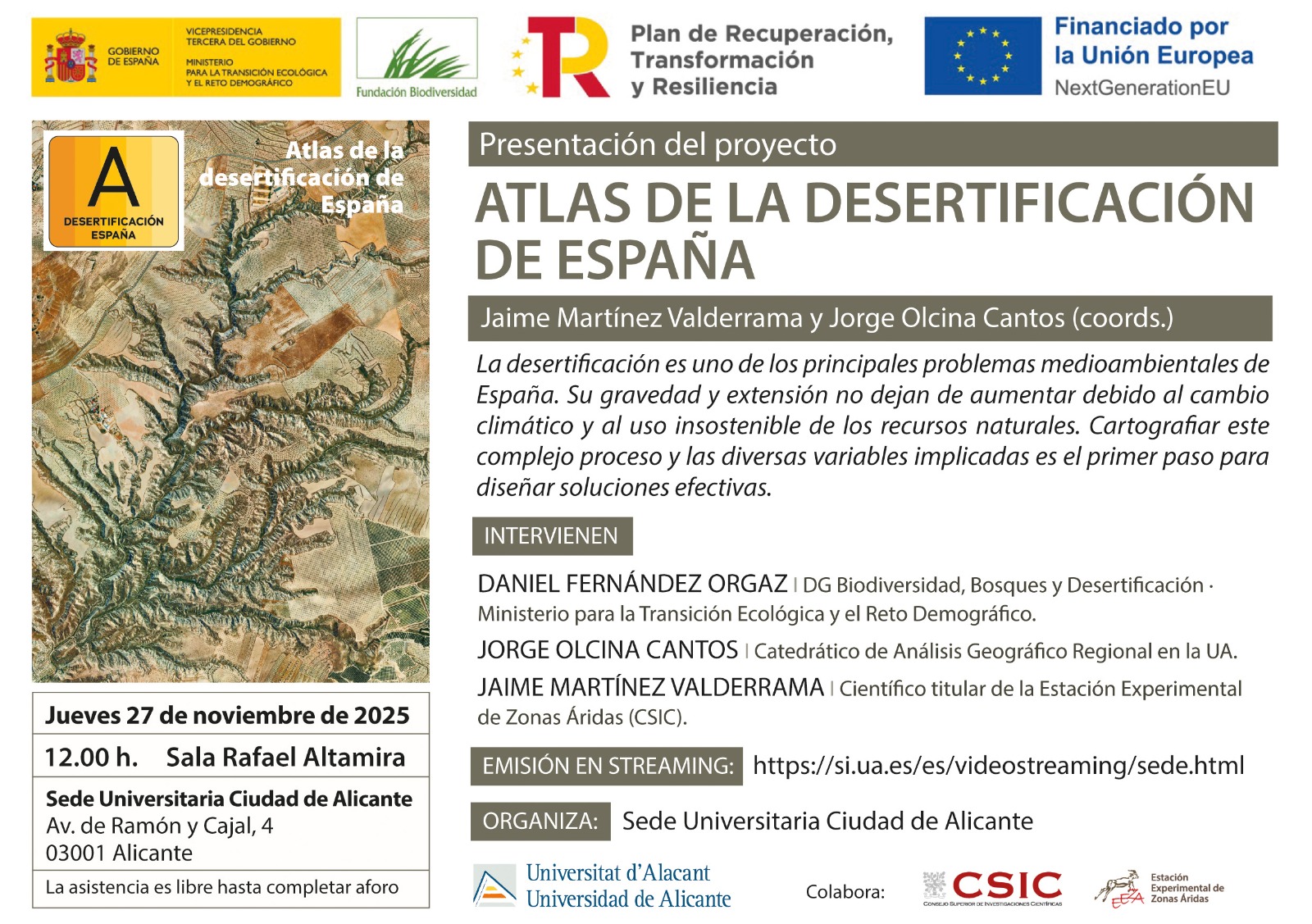 La Sede Universitaria Ciudad de Alicante ha acogido la presentación del Atlas de la desertificación de España, un proyecto coordinado por los investigadores Jorge Olcina Cantos, catedrático de Análisis Geográfico Regional de la Universidad de Alicante, y Jaime Martínez Valderrama, científico de la Estación Experimental de Zonas Áridas del Consejo Superior de Investigaciones Científicas (CSIC), que han estado acompañados en el acto de presentación por Daniel Fernández Orgaz, director general de Biodiversidad, Bosques y Desertificación (Ministerio para la Transición Ecológica y el Reto Demográfico).