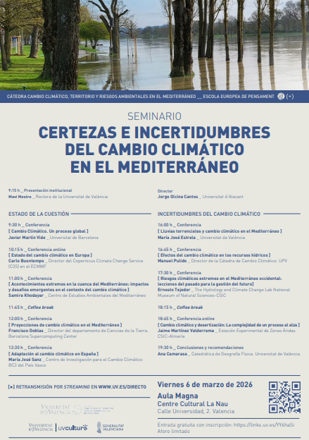 La Cátedra Cambio Climático, Territorio y Riesgos Ambientales en el Mediterráneo de la Universitat de València organiza el seminario "Certezas e incertidumbres del cambio climático al mediterráneo", que se celebrará el viernes 6 de marzo de 2026 en el Centro Cultural La Nave de la Universitat de València.