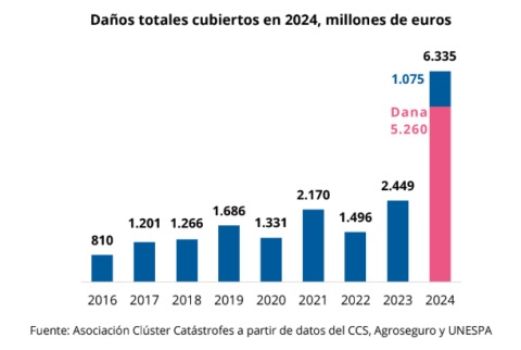 Según el Barómetro de Catástrofes 2024, de la factura total, 6.335 millones correspondieron a costes asegurados (es decir, cubiertos por alguna póliza aseguradora) y 2.450 a costes no asegurados (no cubiertos por ningún seguro, principalmente por no contar con póliza contratada).